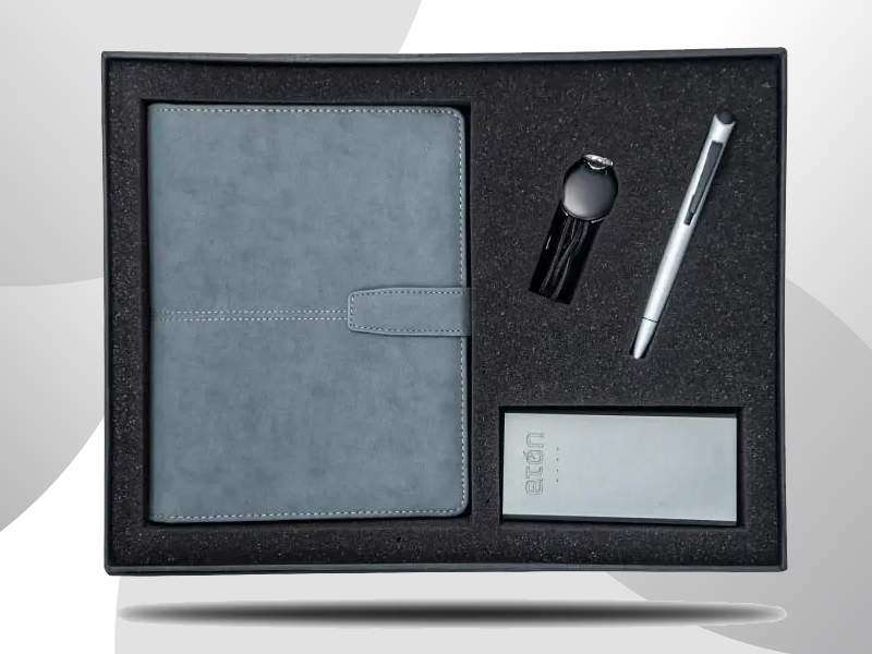 This 4-piece gift set does just that, with its classy, elegant, and resourceful pieces, designed to be used every day while maximizing your branding. The set consists of: The HOD: A high-end, luxurious grey suede A5 cross-functional organizer featuring dated or undated replaceable sheets. With a magnetic closure, spacious pockets, a pen loop, card slots, and an ID holder, this organizer is perfect for keeping your documents and notes organized in style. Eton (power bank): A genuine heavy-duty 8400mAh power bank with a durable metal body, equipped with dual USB outputs to charge two devices simultaneously. A charging cable is included for added convenience. A metal keychain with a branding area for your company name or logo, offering additional personalization to the set. A sleek metal pen that combines elegance with practicality, making it a stylish and functional tool for daily use. Our products combine high-quality craftsmanship with a personalized touch, ensuring your brand stands out.