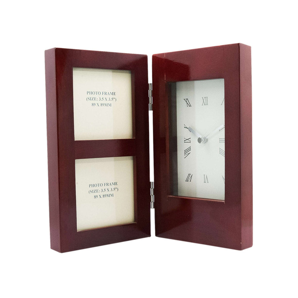 "Capture your most treasured moments while staying on schedule with this stunning Table Clock with Two Photo Frames. Expertly designed with a unique book-folding style, this wooden analogue clock doubles as a decor piece that beautifully displays two 3.5 x 3.5-inch photo frames. The warm wooden finish and classic design bring a touch of elegance and sophistication to any setting, making it a wonderful addition to your desk, mantle, or bedside table. Whether you're cherishing family memories or showcasing special occasions, this clock offers a blend of practicality and sentimentality that is both timeless and heartfelt. Its compact yet stylish design makes it an ideal gift for loved ones or a meaningful way to enhance your personal space. This versatile piece is more than just a clock—it's a keepsake that adds warmth and personality to your home or office." Crafted from premium wood, this analogue clock features a durable construction that ensures lasting beauty and functionality. The photo frames on either side are perfectly sized to hold 3.5 x 3.5-inch pictures, making it easy to swap out images to suit the moment or occasion. Designed in a unique book-folding style, the clock and frames combine seamlessly to create a cohesive, elegant design that is both decorative and practical.