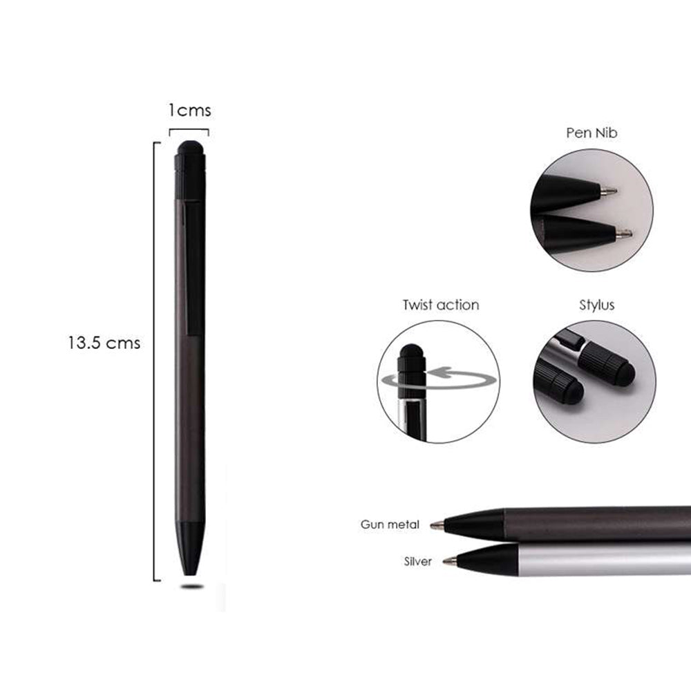 Simple, elegant, and dependable, the Stiletto Silver is a stylish twist-action ballpoint pen featuring a sleek gunmetal finish. Designed with an integrated stylus for touch-screen convenience, it offers both functionality and sophistication. Ideal for branding, this pen becomes a memorable promotional giveaway when customised with your company logo.